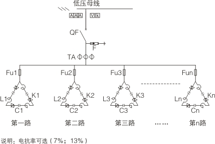 低壓TSC動(dòng)態(tài)無功補(bǔ)償裝置采用人工智能控制,由控制器、雙向可控硅、電容器、電抗器、保護(hù)元件等組成??刂破鲗?shí)時(shí)跟蹤測(cè)量負(fù)荷的功率因數(shù)和無功電流,與預(yù)先設(shè)定的給定值進(jìn)線比較,動(dòng)態(tài)控制電容器組的投切,以保證功率因數(shù)達(dá)到設(shè)定值。整個(gè)測(cè)量執(zhí)行過程在一個(gè)周波內(nèi)完成(時(shí)間<20ms),并實(shí)現(xiàn)可控硅過零觸發(fā),確保投切電容器無沖擊、無涌流、無過渡過程